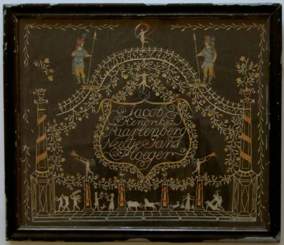 Knipwerk, gedeeltelijk ingekleurd, op zwarte ondergrond in zwarte lijst; gemaakt ter gelegenheid van het 15-jarig huwelijk (gehuwd 06.06.1797) van Jacob Hendriksz Paarl(en)berg, en Neeltje Jans Ploeger. De voorstelling is een ereboog met daarin de spreuk EENDRAGT MAAKT MAGT met links en rechts: TULPE STEIJN en daaronder een schild met bovengenoemde namen. Anno 1812